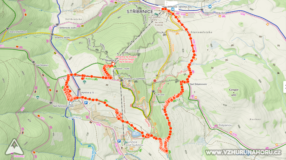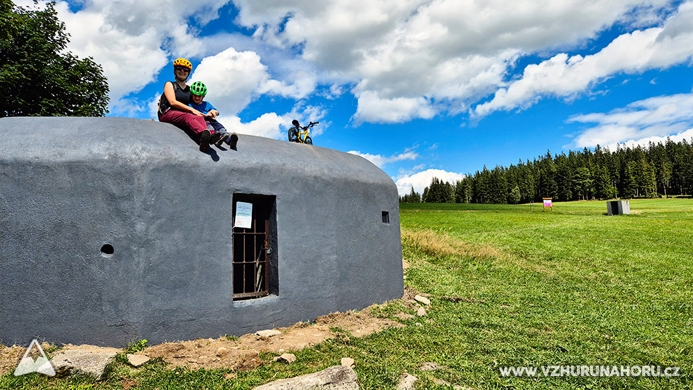 Trail & Enduro Park Kraličák nabízí celkem 22 km tratí různých náročností od flow trailů pro začátečníky až po technické enduro traily. My tu dnes jsme i s malým prckem a tak nám bude stačit zelený trail Rodinný Stříbrňák (6,8 km) – nejdelší a nejoblíbenější nenáročný sjezd vhodný pro malé děti a začátečníky. ![]() Parkujeme na parkovišti u spodní stanice sedačkovky D-line ve Stříbrnicích, která nás za pár minut i s koly vyveze na vrchol kopce Štvanice (866 m.n.m.) ![]() Na vrcholu se příliš dlouho nezdržujeme a vyrážíme rovnou dolů směrem k Hynčicím. Podle mapy vede náš zelený trail trochu nudně rovně po sjezdovce ke spojovací cestě. A tak si začátek zpestříme kouskem na modrém flowčku, který nabízí na rozehřátí příjemné mírné klopenky. ![]() Na spojovací polní cestě už vidíme v dálce klikatící se klopenky nad Hynčicemi a po cestě Bunkr VIII/55/A-180, u kterého musíme samozřejmě zastavit a pořádně jej prozkoumat. ![]() Od bunkru přejedeme přes silnici a už se dostáváme k sérii těsně po sobě jdoucích klopenek. Mezi nimi jsou i ne úplně malé boule, které našemu dětskému parťákovi nejprve trochu nahnaly strach. Ale jakmile jsme pár z nich přejeli bez nehody, strach se změnil v radostné výskání a část úseku jsme museli opakovat ještě jednou. ![]() Na konci klopenek nás čeká za odměnu další bunkr. ![]() ![]() Od něj přejíždíme znovu přes silnici a krátkou rovnou spojovačkou se dostáváme k rybníku Úžas, kde využíváme příjemné malé občerstvení, zatímco náš malý vyrazil prozkoumávat místní pískoviště. Dokonce by tu snad měla být i možnost zapůjčení paddle boardů. ![]() ![]() Za rybníkem se zelený trail rozděluje. Jedna část končí v Hynčicích u bikecentra Kolovna. My ale pokračujeme po druhé trase zpátky směrem ke Stříbrnicím. ![]() Odměnou nám jsou další pohodové cestičky, boule, klopenky... ![]() ... výhledy ... ![]() ... a sem tam i nějaké zpestření pro děti. ![]() Následuje ještě pár dalších klopenek, nějaký ten další bunkr a pak dlouhý sjezd po široké polní cestě zpátky k parkovišti ve Stříbrnicích. ![]() Na konci pak ještě potrénujeme pumpování na pumptracku u spodní stanice lanovky, doplníme energii v místním občerstvení a pak už vzhůru domů. Závěrečné shrnutí: celý trail se vine krásnou krajinou pod Králickým Sněžníkem s nádhernými výhledy, povrch trailu hladký, žádné kameny, žádné kořeny, žádné zákeřnosti, délka trailu tak akorát, na trase možnost občerstvení, na první seznámení s trailovým ježděním pro dítě ideální. Trasa na mapy.cz |